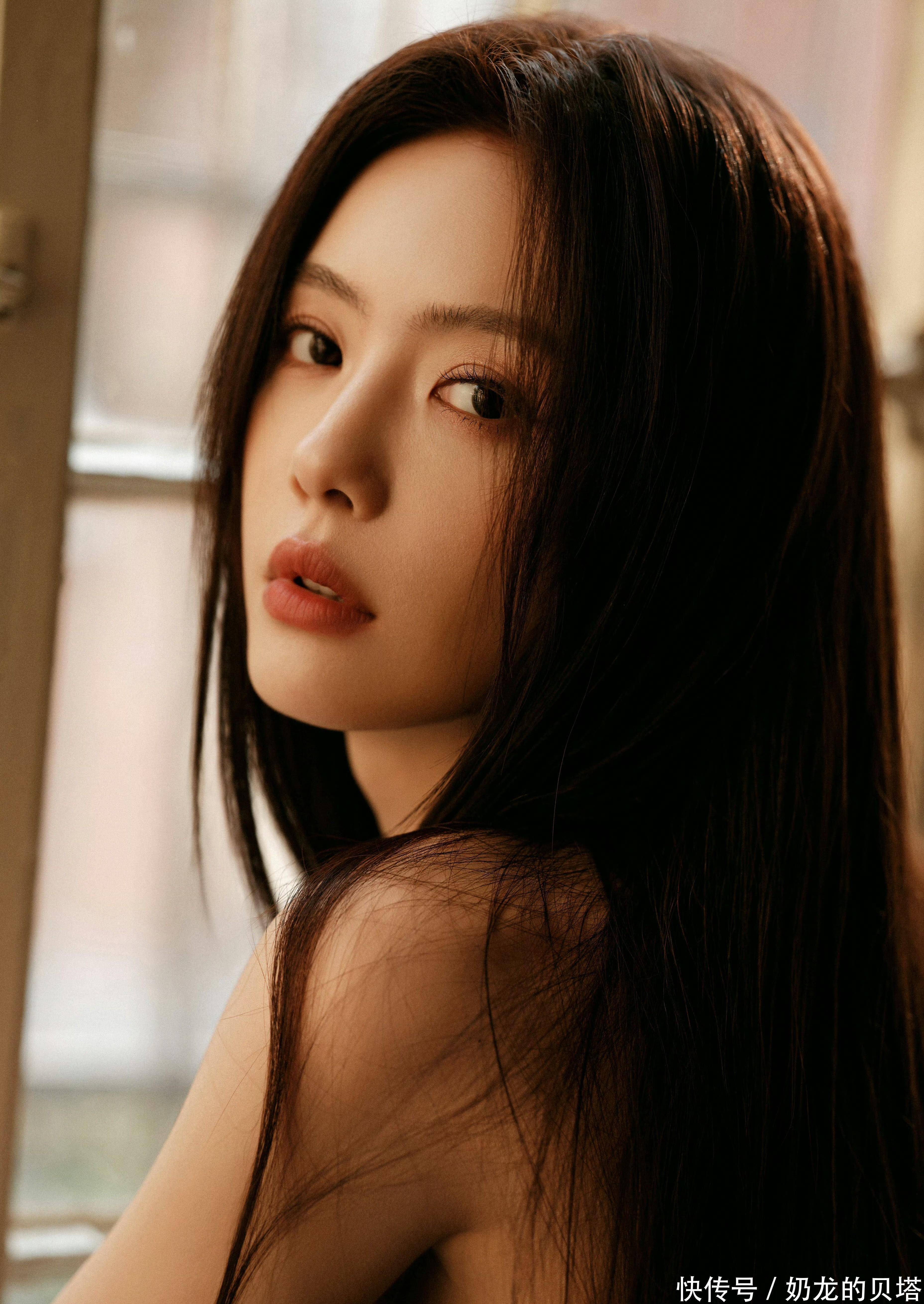 最后说她的pose和氛围营造。靠墙站立时手肘微曲,既避免了手臂显粗,又营造出松弛的氛围感;窗边闭眼仰头的动作,让阳光刚好落在发梢和肩线,把缎面裙的光泽感衬得更明显。这种“不费力的性感”,比硬凹造型高级太多。