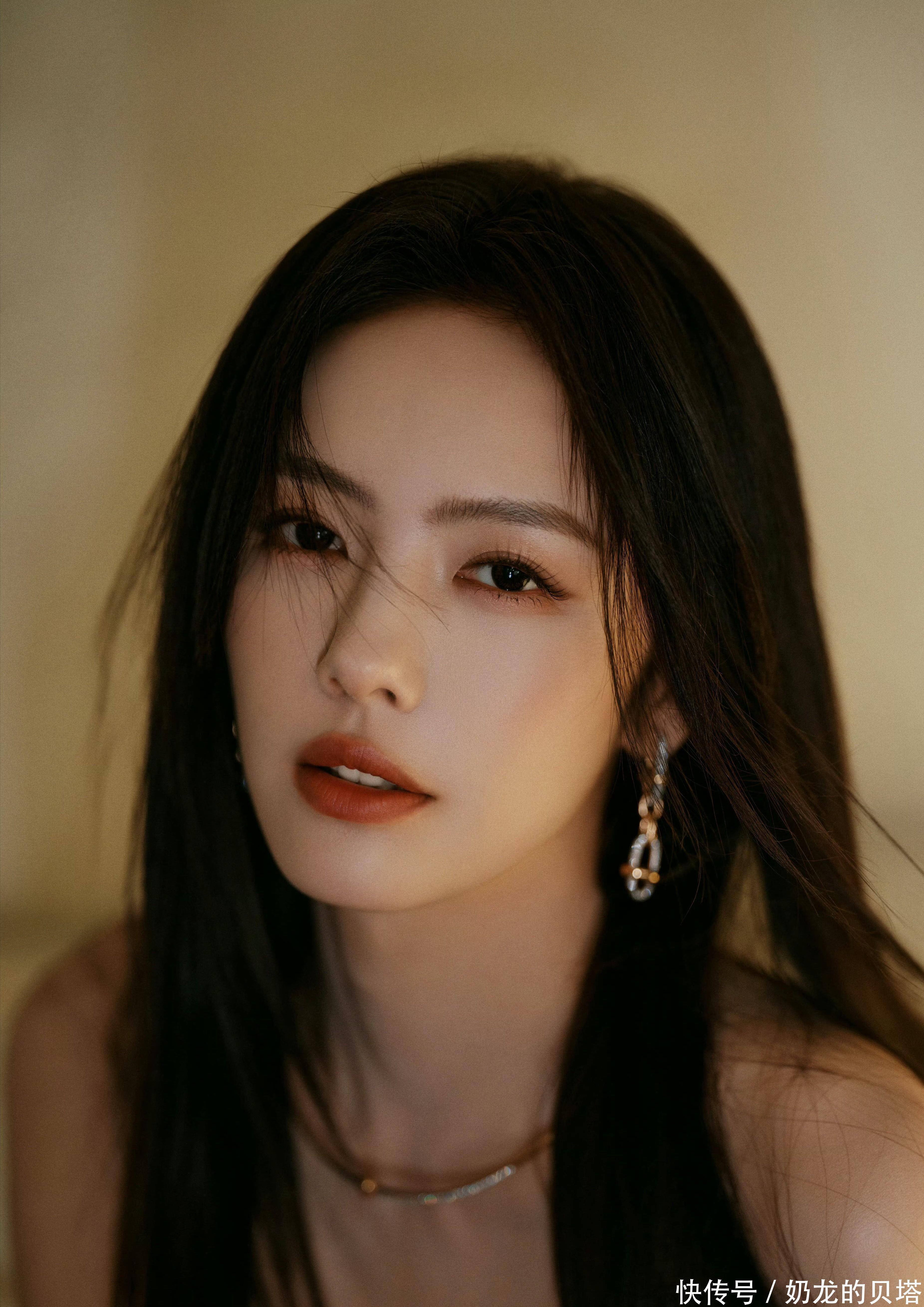 再看配饰的小心机。她没有选择夸张的项链,而是叠戴了两条细链:一条是极简的素圈,一条是带碎钻的锁骨链,若隐若现地贴在肌肤上,刚好填补了抹胸领口的空白。耳环选了垂坠感的几何造型,走动时会随着动作轻轻晃动,给整体造型增加了灵动感。最绝的是她的妆容,红棕调口红和暖调眼影呼应了整体的复古氛围,没有多余的色彩堆砌,完全服务于穿搭。