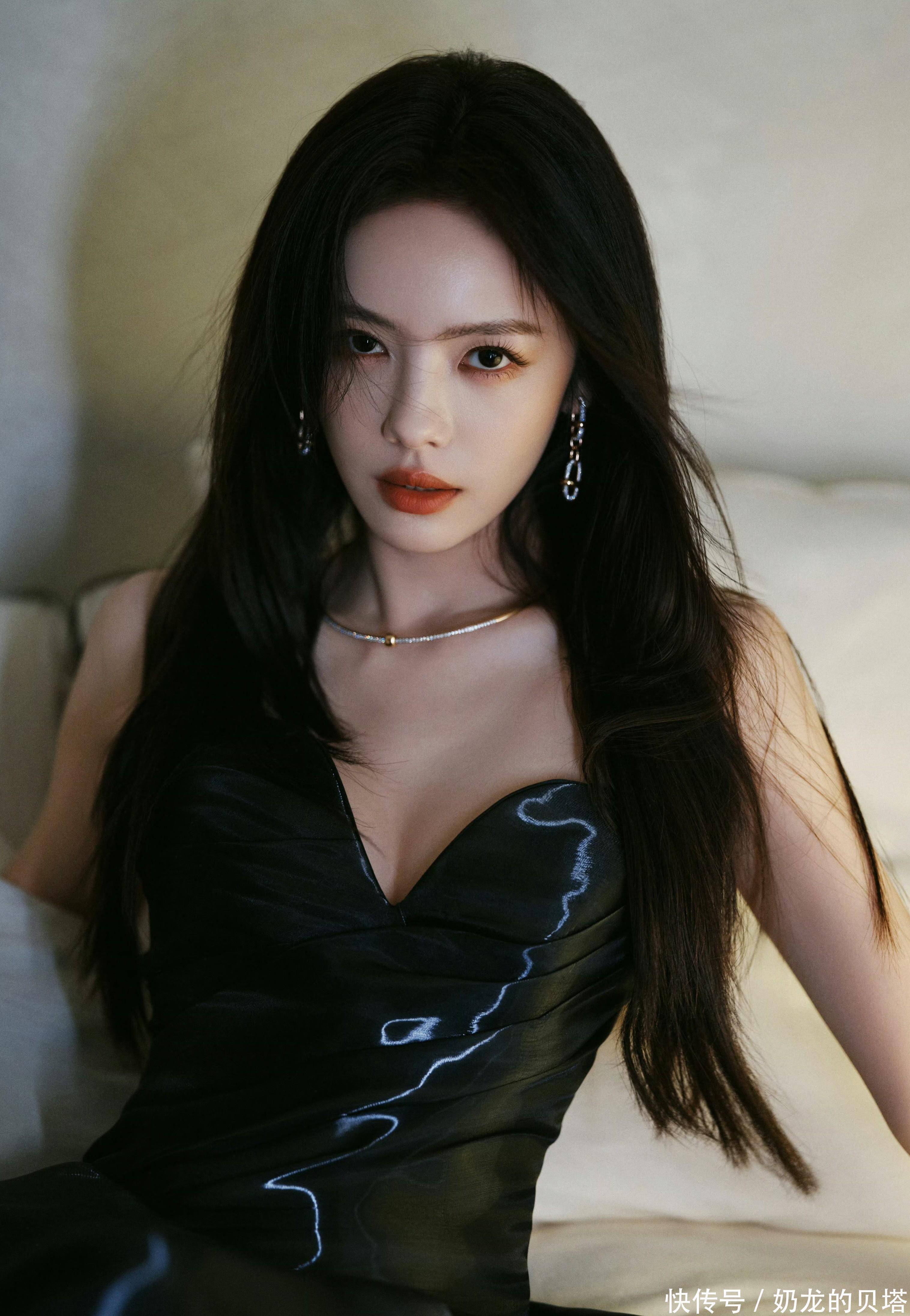 首先说这件裙子本身,面料选得太绝了。不是哑光黑的沉闷,也不是亮面的廉价,而是那种自带水波纹光泽的缎面材质。光线打上去,裙身会流动出细碎的银白纹路,像把银河揉进了布料里。抹胸的V型剪裁刚好卡在锁骨下方,既露出了精致的肩颈线条,又不会过分暴露,配上她细长的天鹅颈,高级感直接拉满。